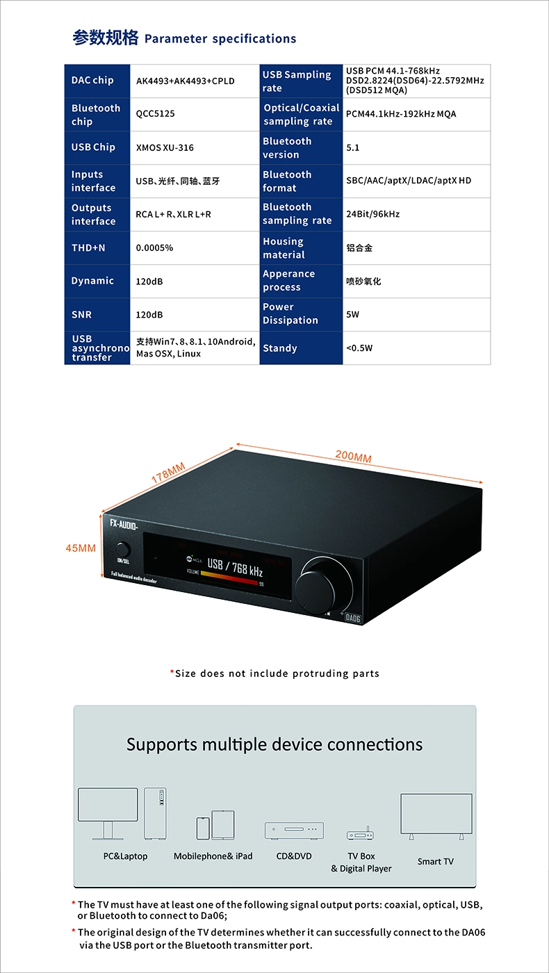 FX-AUDIO DA06 призначений для використання як основне джерело цифрового сигналу високої роздільної здатності в настільній або домашній аудіосистемі. Пристрій забезпечує якісне перетворення сигналу з ПК, CD-транспорту, мережевих джерел або Bluetooth-пристрою та передає його на підсилювач чи активну акустику.
