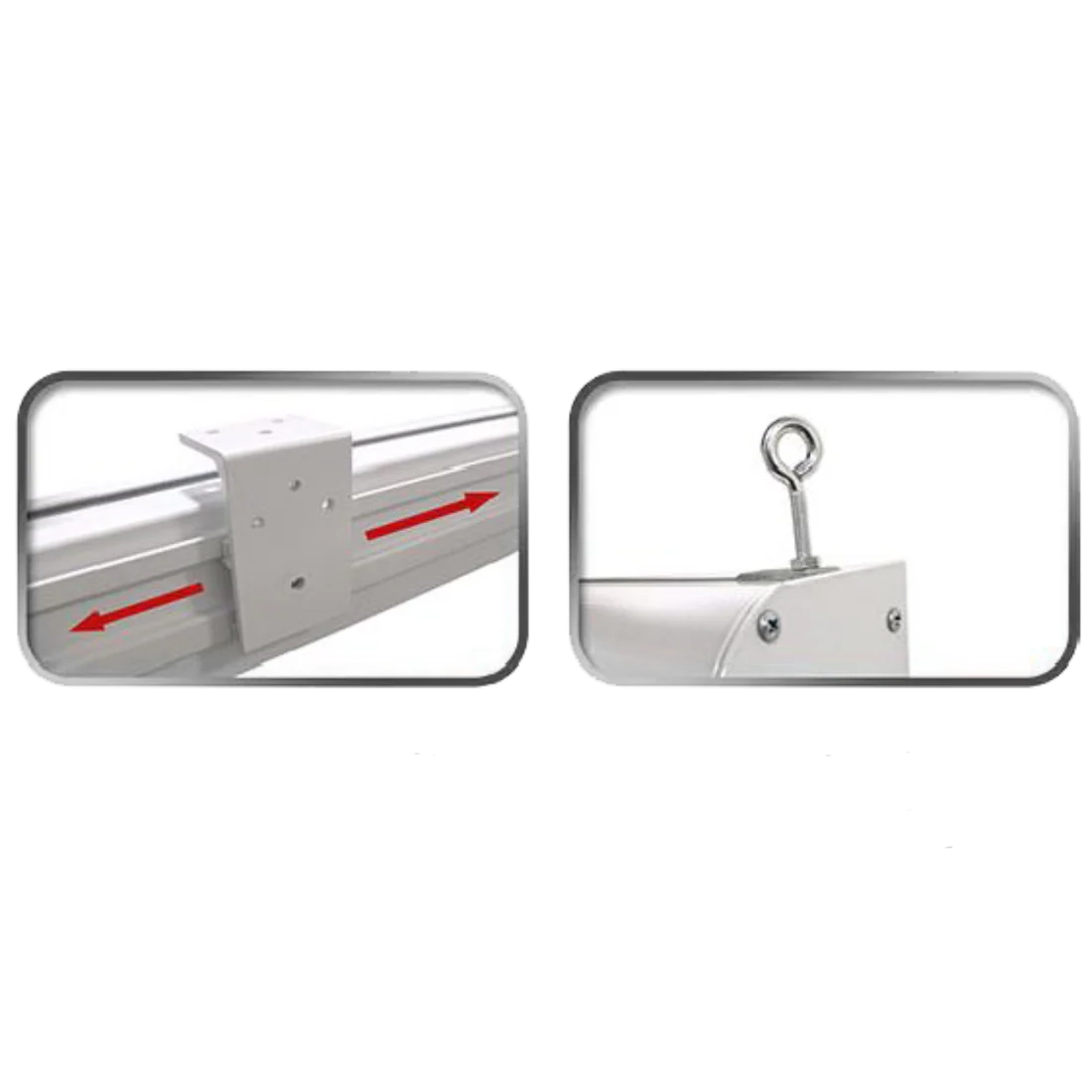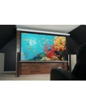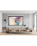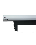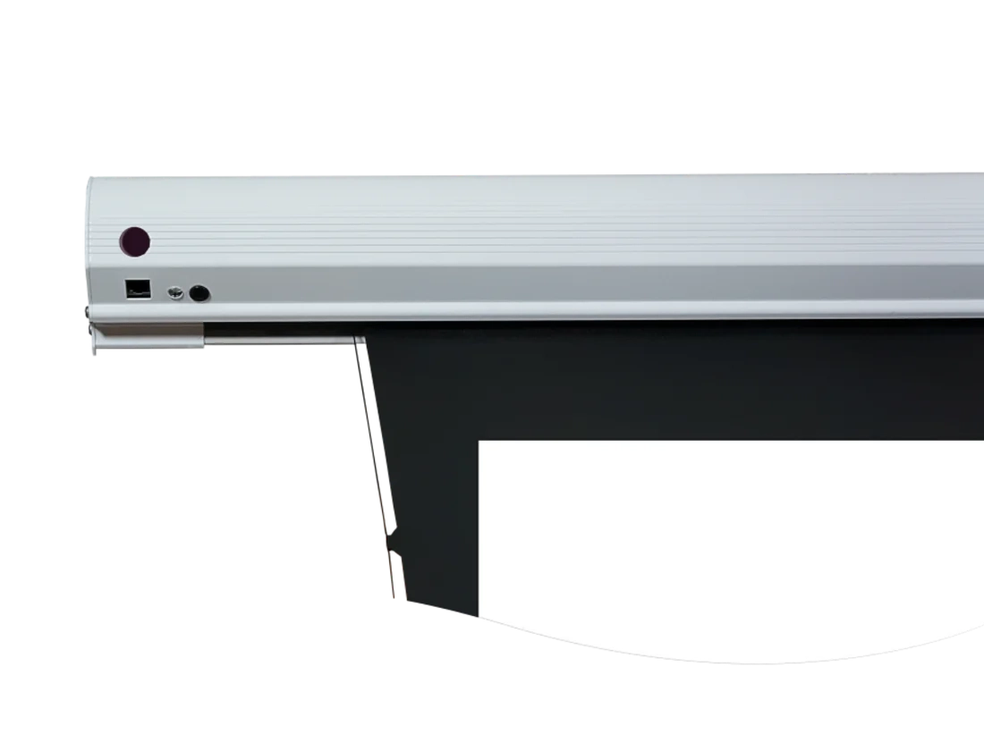 Екран оснащений моторизованим приводом, верхнім відступом 60 см , білим корпусом, настінним або стельовим кріпленням та пультом дистанційного керування. Підтримує HD, 8K та Active 3D.