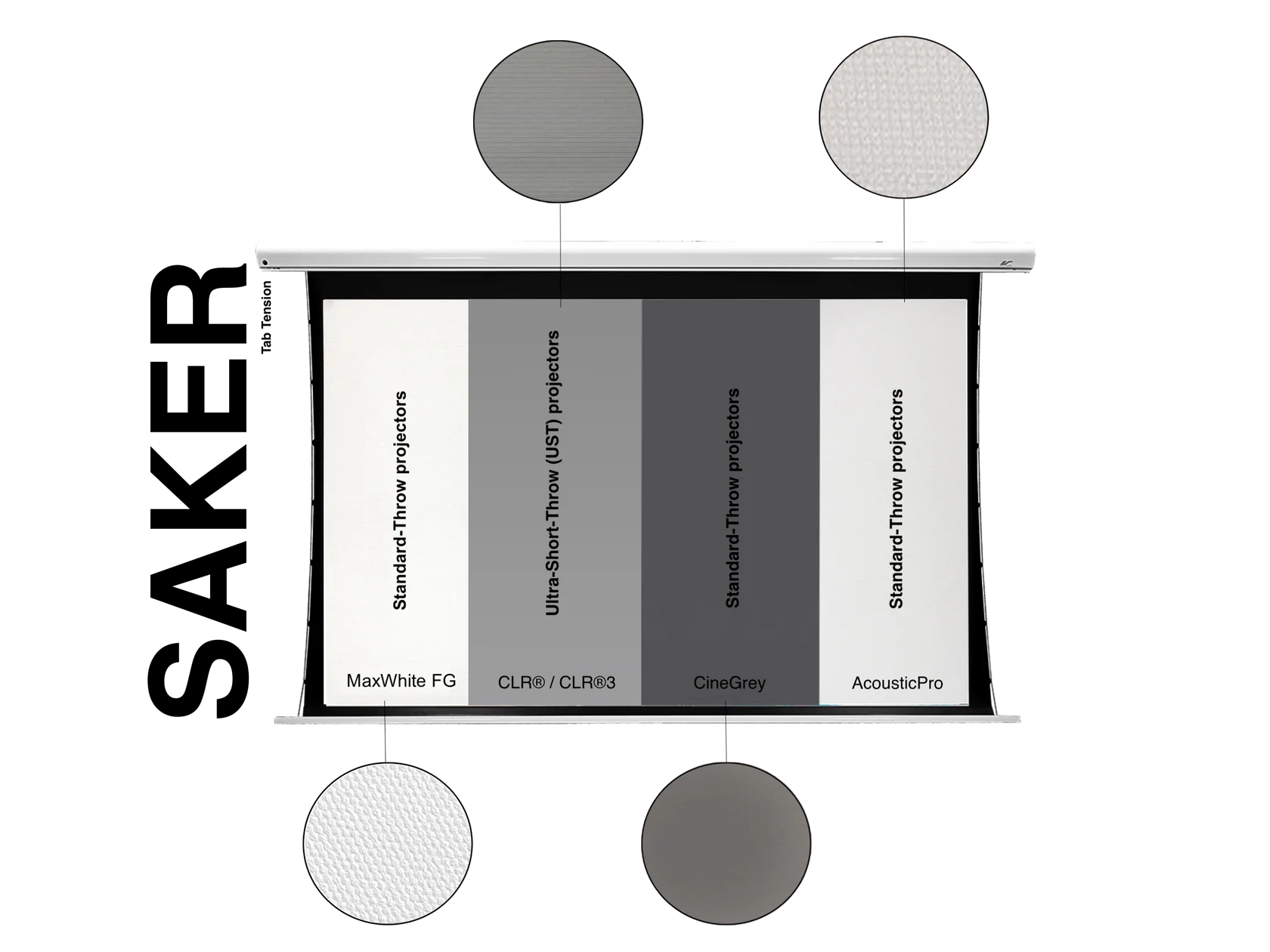 Електричний натяжний екран Elite Screens Saker Tab-Tension SKT84XHW-E24 оснащений полотном MaxWhite FG , призначеним для стандартних проекторів (Standard-Throw). Натяжна система Tab-Tension підтримує точну геометрію поверхні, забезпечуючи стабільне та рівне зображення по всій площі екрана.