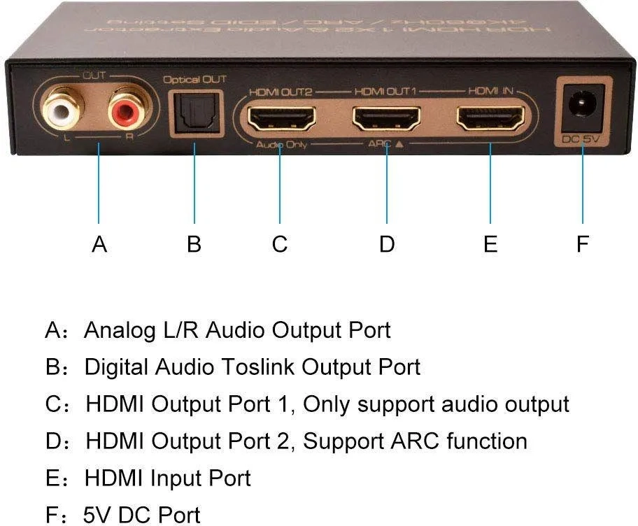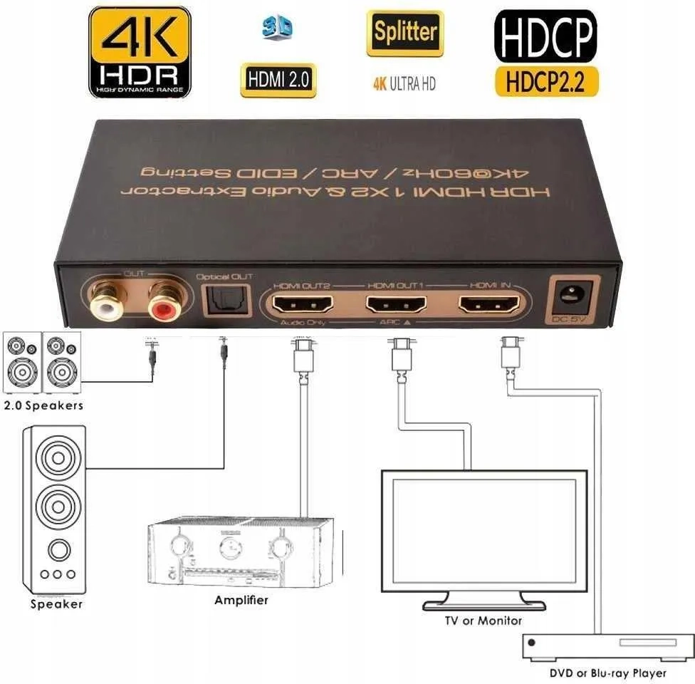 Виходи: HDMI OUT2 – наскрізний 4K@60 HDR (з підтримкою ARC для ТБ), HDMI OUT1 – HDMI «тільки аудіо»; плюс окремі аудіовиходи : оптичний Toslink та аналогові RCA L/R . Підтримуються режими EDID 2.0/5.1, формати Dolby TrueHD/DTS-HD/LPCM 7.1, HDCP 2.2. Вирішує сумісність нового HDR-джерела зі старим AV-ресивером/підсилювачем.