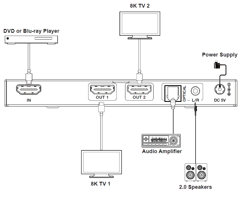 Цей спліттер 8K HDMI 1x2 Splitter дозволяє розподілити один сигнал джерела HDMI на два будь-які пристрої відображення. Він підтримує роздільну здатність відео до 8K@60 Гц 4:2:0. Підтримується розширене керування EDID та функція деембеддінгу звуку (виведення через оптичний та аналоговий порт). Цей багатофункціональний продукт може широко застосовуватись у сценаріях демонстрації, відеоконференції, мультимедійного навчання та інших випадках, які потребують демонстрації на великому екрані.