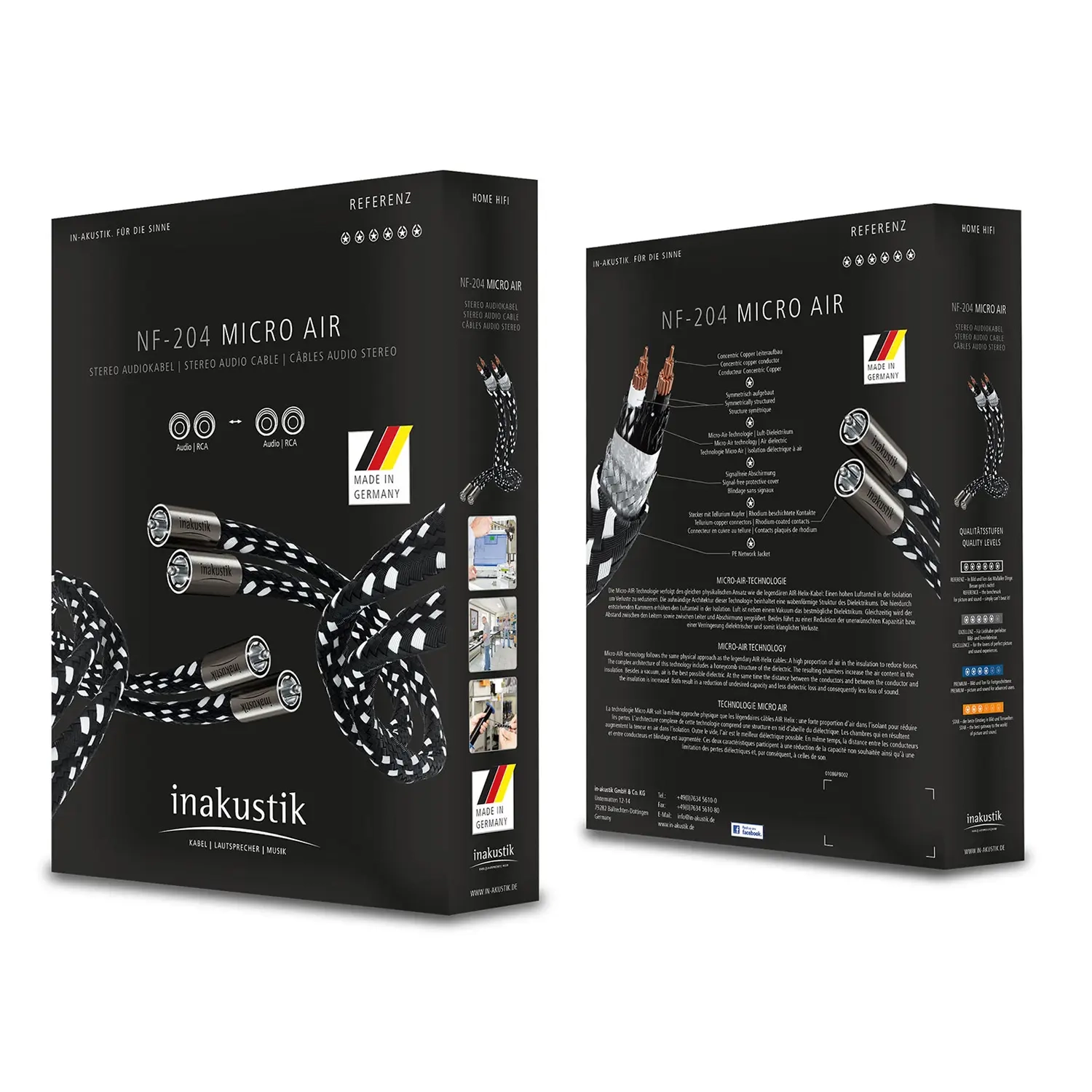 Inakustik Referenz NF-204 Micro AIR – висококласний аналоговий міжблочний RCA-кабель, призначений для підключення компонентів Hi-Fi та High End аудіосистем. Кабель виконаний за симетричною конструкцією Double Mono з повітряним діелектриком Micro AIR, що мінімізує ємність та зберігає чистоту сигналу. Провідники з високочистого OFC-міді, подвійне екранування та роз'єми з родієвим покриттям забезпечують стабільну передачу аудіосигналу без втрат та перешкод. Вироблений у Німеччині.