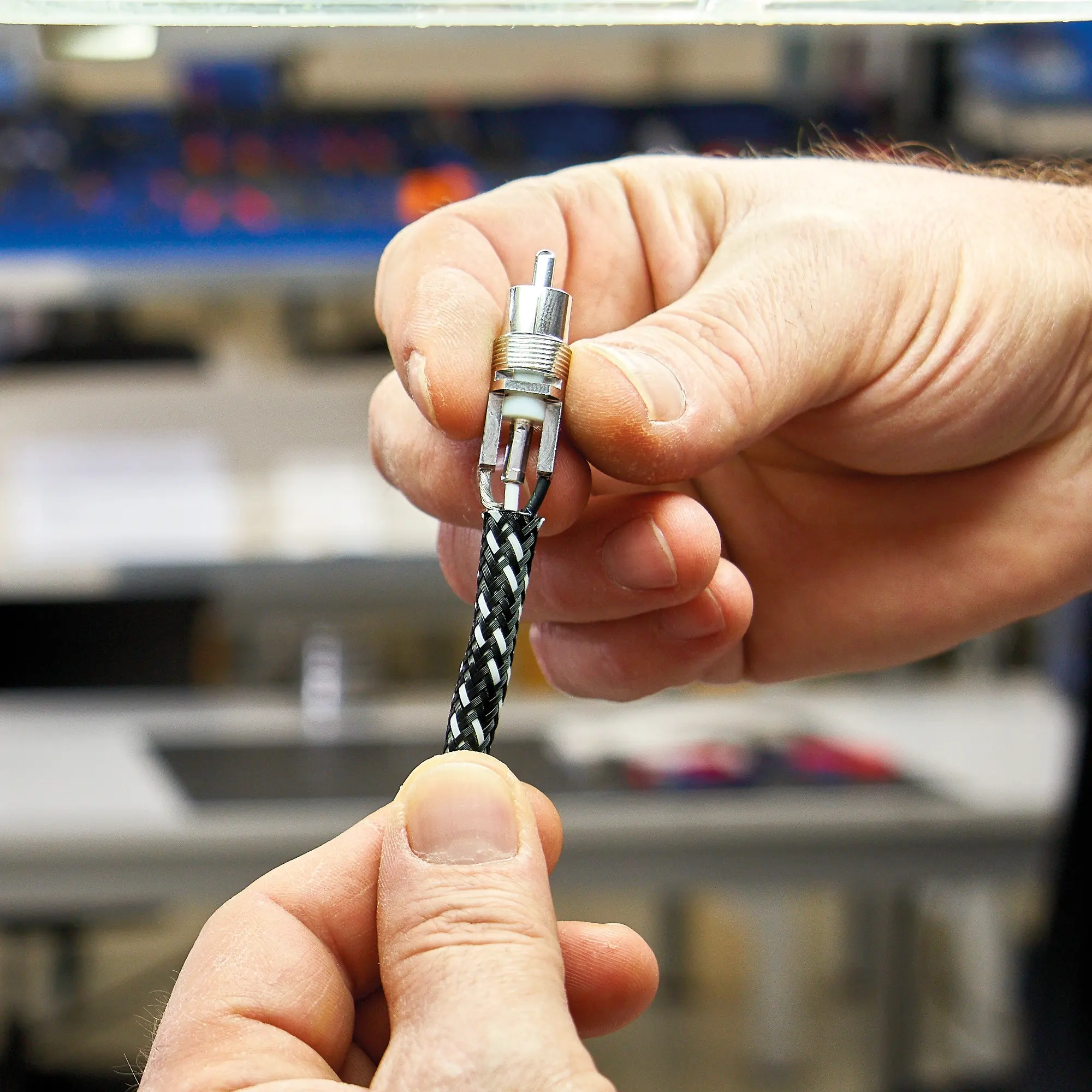 Як провідники використовують концентричну мідь високої очистки OFC. Роз'єми RCA виготовлені з телурової міді, мають родиєве покриття та встановлюються методом пресування із зусиллям до 1,5 тонн для надійного та довговічного контакту. Корпус роз'ємів виконаний із цільного металу.