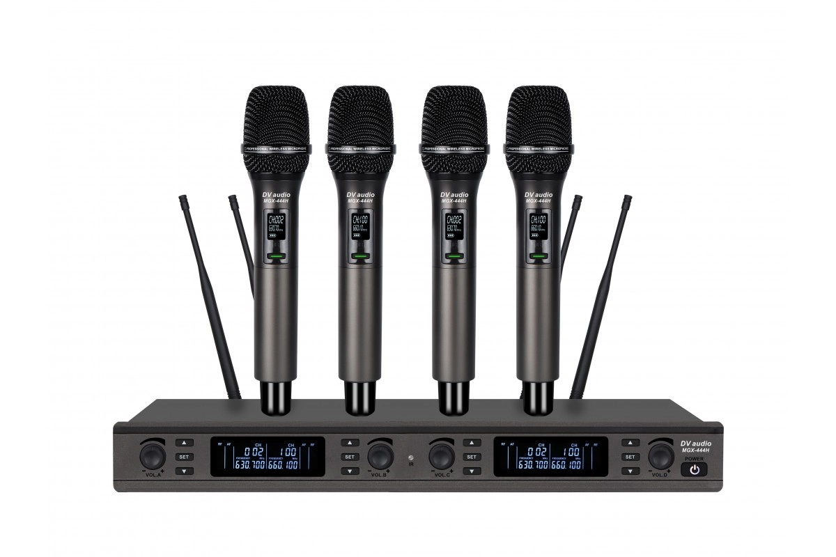 DV audio MGX-444H - це багатоканальна радіосистема з чотирма ручними мікрофонами, призначена для використання в караоке-клубах, конференц-залах, на сцені та під час проведення заходів. Дозволяє одночасно працювати кільком користувачам без дротів.