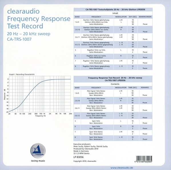 Clearaudio Frequency Response Test Record CA-TRS-1007 - найточніший контрольний запис для тестування картриджів, тонармів та програвачів із частотною розгорткою від 20 Гц до 20 000 Гц та точністю ±0.5 дБ у всьому діапазоні частот! Тестовий диск Frequency Response Test Record від Clearaudio – це унікальний інструмент для налаштування та перевірки програвача.